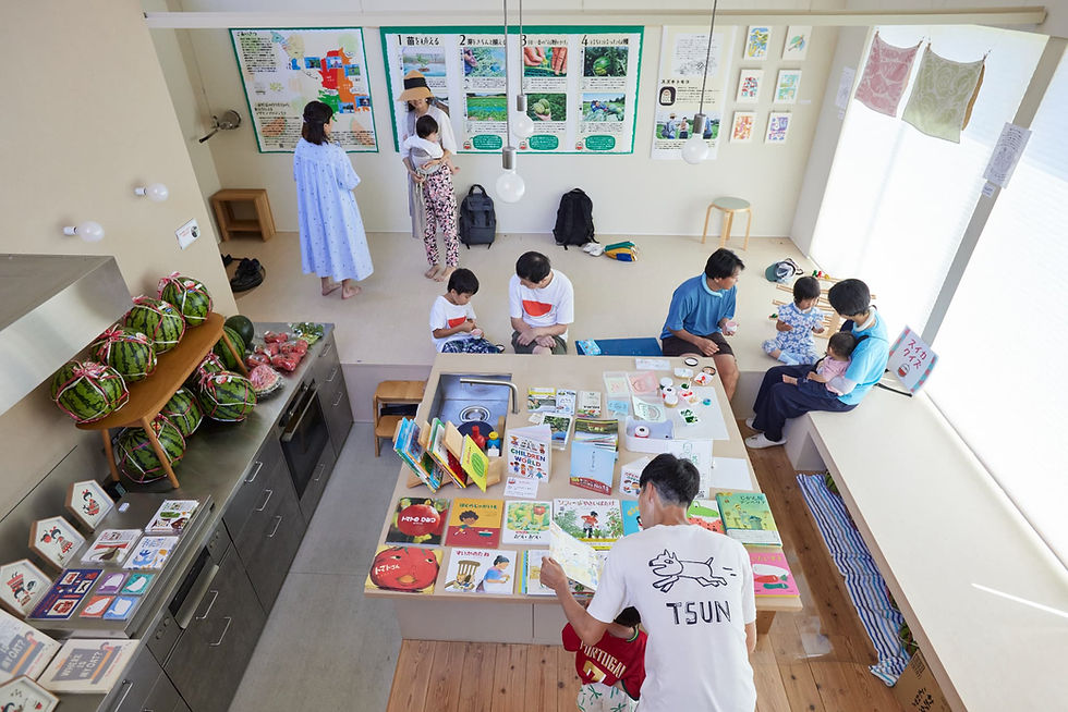 ギャラリーの中央にある大きなテーブルを囲むように、参加者の皆さんが思い思いの時間を過ごしていました。スイカソルベを嬉しそうにほおばる姿や、ずらりと並んだ絵本やワークショップに夢中になる親子の姿がありました。