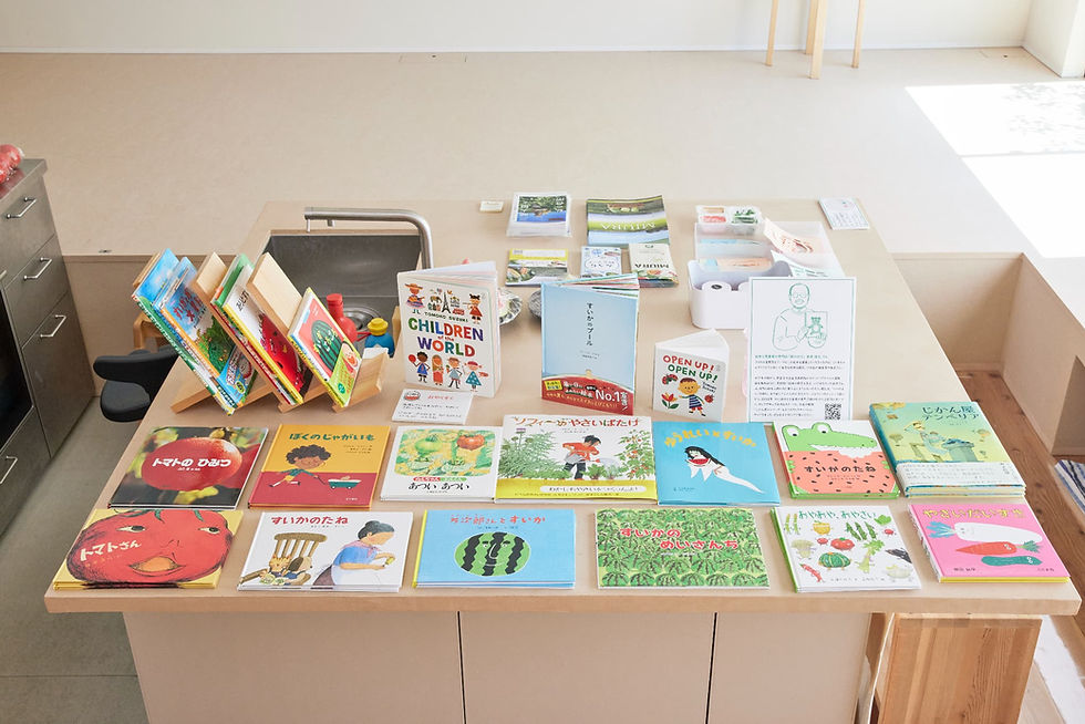 テーブルの上には、三浦半島の町がモデルになっている絵本「すいかのめいさんち」、アメリカの大人気絵本「すいかのたね」を始め、スイカや夏野菜をテーマにした絵本がずらり。